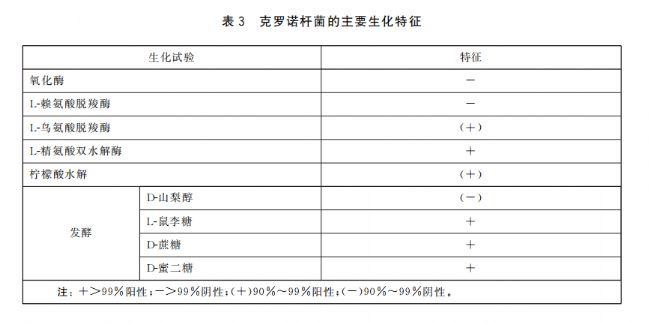 3、確證實(shí)驗(yàn):將可疑菌落接種 TSA平板后進(jìn)行生化鑒定?梢允紫辱b定克羅諾桿萌顯色培養(yǎng)基平板上最具特征性的菌落接種的 TSA 平板上的菌落。如果是陽(yáng)性,則不需要測(cè)試其他TSA 平板上的菌落。如果是陰性,則選取其他 TSA 平板上的菌落進(jìn)行鑒定,直到全部為陰性或發(fā)現(xiàn)陽(yáng)性菌落為止。為確保結(jié)果的準(zhǔn)確性,對(duì) TSA 平板上的菌落進(jìn)行鑒定時(shí),應(yīng)使用新鮮的傳代菌落?肆_諾桿菌的主要生化特征見(jiàn)表3。