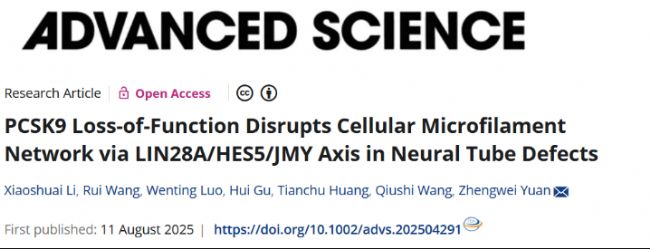 [1]Li X, Wang R, Luo W, et al. PCSK9 Loss-of-Function Disrupts Cellular Microfilament Network via LIN28A/HES5/JMY Axis in Neural Tube Defects. Adv Sci (Weinh). Published online August 11, 2025. doi:10.1002/advs.202504291