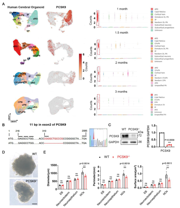 (A)不同發(fā)育時(shí)間點(diǎn)的人腦類器官中PCSK9表達(dá)和統(tǒng)計(jì)結(jié)果。(B)CRISPR/Cas9介導(dǎo)的PCSK9位點(diǎn)的缺失結(jié)果。(C)WT和PCSK9-/- ESC中PCSK9的表達(dá)結(jié)果 (D)WT和PCSK9-/- NO的代表性圖像。(E)NO的直徑、周長和表面積的量化結(jié)果。[1]