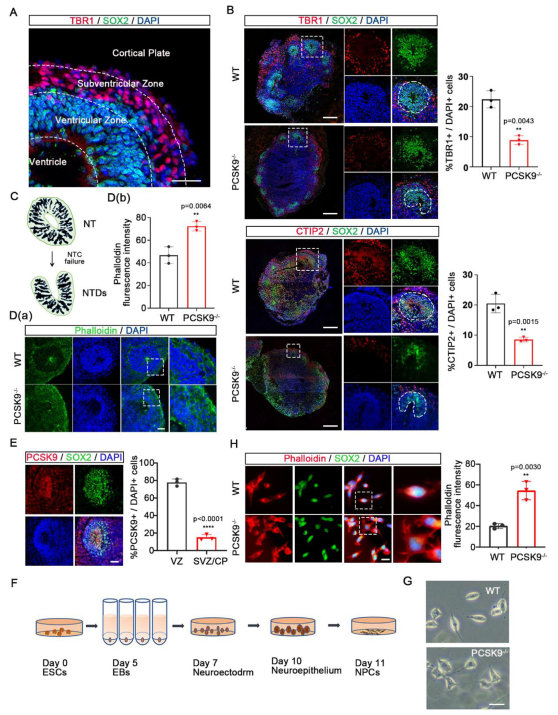 (A)NOs表現(xiàn)出三種不同的NT結(jié)構(gòu):心室、心室區(qū) (VZ)和心室下區(qū)/皮質(zhì)板SVZ/CP。(B)WT和 PCSK9-/- NO中成熟神經(jīng)元的免疫熒光染色結(jié)果。正方形表示NT結(jié)構(gòu),而白色圓形或不規(guī)則形狀表示VZ區(qū)域。(C)異常NTC引起的NTD示意圖。(D)WT和 PCSK9-/- NO的NT結(jié)構(gòu)中細(xì)胞微絲的免疫熒光染色結(jié)果。(E)熒光染色顯示PCSK9在WT NO的NT結(jié)構(gòu)中的定位和表達(dá)結(jié)果。(F)NPC誘導(dǎo)培養(yǎng)模型圖。(G)WT 和PCSK9-/- NPC的代表性光學(xué)結(jié)果。(H)WT和PCSK9-/- NPC中細(xì)胞微絲的免疫染色結(jié)果。[1]