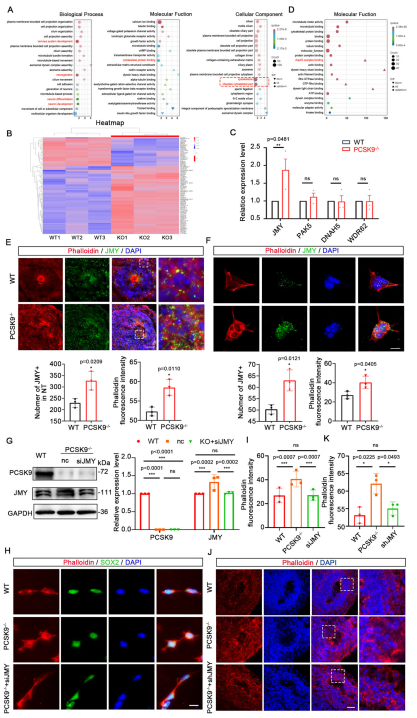 (A)GO分析中與生物過程、分子功能和細(xì)胞成分相關(guān)的項(xiàng)目結(jié)果。(B)細(xì)胞骨架蛋白項(xiàng)目中所有DEG的熱圖。(C)改變基因的qPCR驗(yàn)證的統(tǒng)計(jì)結(jié)果。(D)細(xì)胞骨架蛋白的分子功能相關(guān)項(xiàng)目。(E,F)JMY和細(xì)胞微絲在NOs(E)和NPCs(F)NT結(jié)構(gòu)上的表達(dá)和共定位的免疫熒光染色結(jié)果。(G)siJMY拯救實(shí)驗(yàn)后WT和PCSK9-/- NPC中PCSK9和JMY蛋白水平的WB結(jié)果。(H,I)WT和PCSK9-/NPC中細(xì)胞微絲的免疫熒光染色結(jié)果。 (J,K)WT和PCSK9-/- NT結(jié)構(gòu)中細(xì)胞微絲的免疫熒光染色結(jié)果。[1]