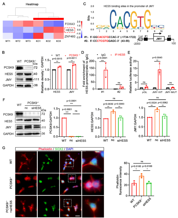 (A)轉(zhuǎn)錄組數(shù)據(jù)庫中FOXA3、HES5和ZNF460表達(dá)水平的熱圖。(B)WT和PCSK9-/- NO中PCSK9、HES5 和JMY蛋白水平的WB結(jié)果。(C)HES5-JMY結(jié)合位點(diǎn)的預(yù)測(cè)。(D)JMY啟動(dòng)子兩個(gè)位點(diǎn)HES5富集的ChIP-qPCR分析結(jié)果。(E)熒光素酶報(bào)告基因?qū)嶒?yàn)驗(yàn)證HES5表現(xiàn)出針對(duì)JMY的轉(zhuǎn)錄活性;(F)siHES5拯救實(shí)驗(yàn)后NPC中PCSK9、HES5和JMY蛋白水平的WB結(jié)果。(G)WT和PCSK9-/- NPC中細(xì)胞微絲的免疫熒光染色結(jié)果。[1]