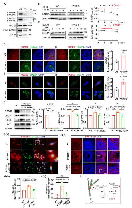 (A)PCSK9和LIN28A的Co-IP結(jié)果。(B)CHX處理后NPC的LIN28A蛋白水平的WB結(jié)果。(C)CHX和 Baf-A1處理后NPC的LIN28A蛋白水平的WB結(jié)果。 (D,E)NOs(D)和NPCs(E)NT中PCSK9、LIN28A和 LAMP1的免疫熒光結(jié)果。(F)siLIN28A救援后NPC 中PCSK9、LIN28A、HES5和JMY蛋白水平的WB結(jié)果。(G)siLIN28A救援的NPC中細(xì)胞微絲的免疫熒光染色結(jié)果。(H)抑制劑1632救援的下NT結(jié)構(gòu)中的細(xì)胞微絲的免疫熒光染色結(jié)果。(I)NTD中PCSK9/LIN28A/HES5/JMY調(diào)節(jié)軸介導(dǎo)的細(xì)胞微絲網(wǎng)絡(luò)組裝改變的簡化示意圖。[1]