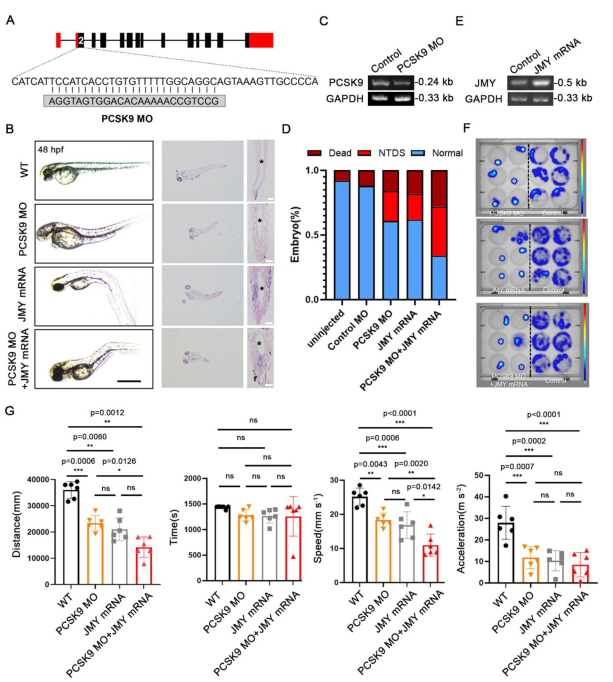 在斑馬魚和哺乳動(dòng)物中,PCSK9均在外胚層早期發(fā)育及神經(jīng)發(fā)生階段持續(xù)表達(dá)。為探究其功能,他們?cè)O(shè)計(jì)了靶向PCSK9第二外顯子的反義嗎啉寡核苷酸(MO),誘導(dǎo)25-bp缺失以抑制其表達(dá)。結(jié)果顯示,PCSK9-MO純合胚胎在48 hpf時(shí)出現(xiàn)神經(jīng)管(NT)結(jié)構(gòu)異常,RT-PCR證實(shí)其PCSK9轉(zhuǎn)錄水平顯著下降。盡管PCSK9-MO單獨(dú)處理僅引起23%(46/200)的神經(jīng)管畸形(NTDs)發(fā)生率,但進(jìn)一步實(shí)驗(yàn)發(fā)現(xiàn),過表達(dá)JMY mRNA可單獨(dú)誘導(dǎo)NTDs,并與PCSK9-MO產(chǎn)生協(xié)同作用:聯(lián)合處理使NTDs發(fā)生率升高至38%(76/200),并伴隨死亡率上升。組織切片顯示,PCSK9-MO斑馬魚表現(xiàn)為神經(jīng)管縮短、管腔擴(kuò)張和神經(jīng)絲紊亂,聯(lián)合JMY過表達(dá)后這些表型進(jìn)一步加劇。行為學(xué)分析表明,PCSK9-MO及JMY過表達(dá)均導(dǎo)致斑馬魚運(yùn)動(dòng)能力下降,表現(xiàn)為運(yùn)動(dòng)距離、速度和加速度的顯著降低,而聯(lián)合處理組上述參數(shù)下降更為明顯。綜上,斑馬魚模型中PCSK9缺失可導(dǎo)致神經(jīng)管發(fā)育異常,而JMY過表達(dá)不僅單獨(dú)誘發(fā)NTDs,還可協(xié)同增強(qiáng)PCSK9缺失所引起的表型嚴(yán)重程度與發(fā)生率。