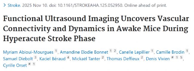 Abioui-Mourgues M, Bonnet AE, Lepillier C, Brodin C, et al. Functional Ultrasound Imaging Uncovers Vascular Connectivity and Dynamics in Awake Mice During Hyperacute Stroke Phase. Stroke. 2025 Nov 10. doi: 10.1161/STROKEAHA.125.052950.