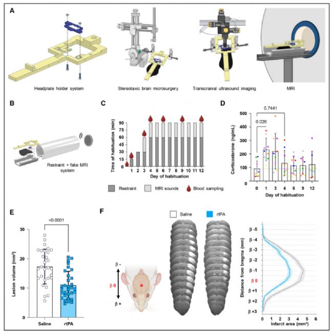 研究在清醒小鼠中建立血栓栓塞性卒中模型,通過顱骨固定板實現無麻醉狀態(tài)下的卒中誘導與多模態(tài)成像(Figure 2,Figure 1A-D)。使用阿替普酶(recombinant tissue-type plasminogen activator, rtPA)或生理鹽水治療,分別在10分鐘、1小時和24小時進行功能超聲與MRI成像,評估腦血流、腦血容量、功能連接與神經血管耦合變化,以揭示早期生物標志物與治療反應。
