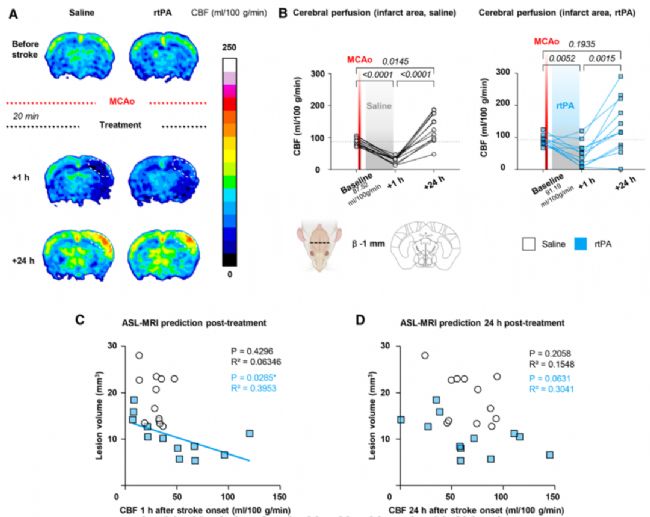 A-B 通過ASL-MRI顯示,卒中后1小時梗死區(qū)腦血流急劇下降,而在24小時后出現過度灌注;rtPA治療在早期有改善血流的趨勢。