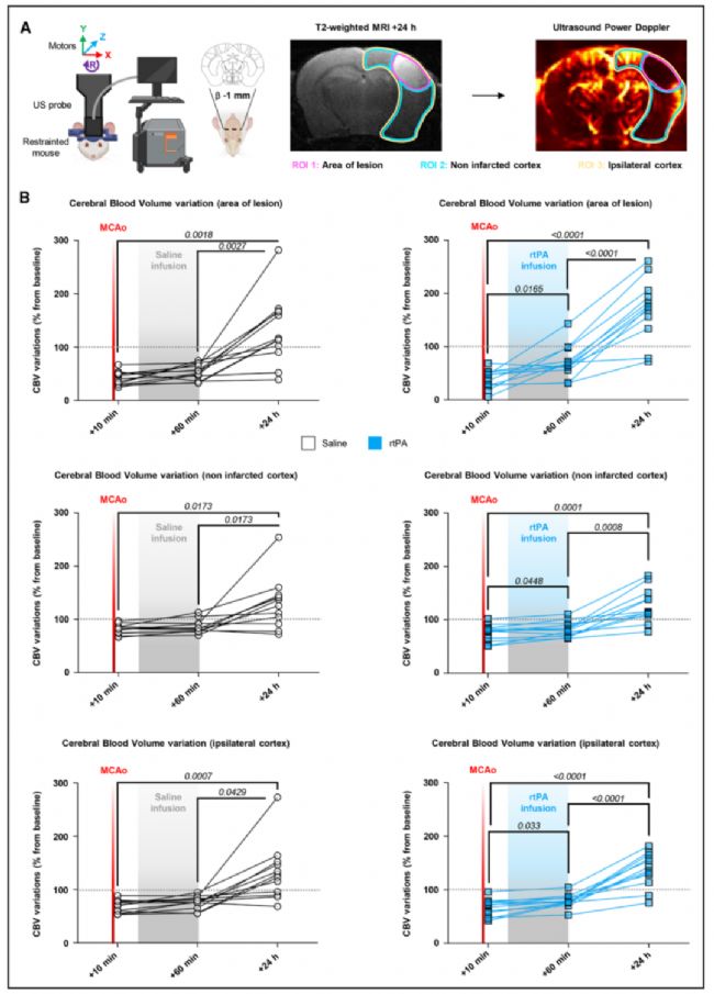 超聲成像顯示,卒中后10分鐘CBV下降約59%-62%(Figure 4)。rtPA治療組在1小時時CBV顯著恢復(+87.3%),而對照組僅部分恢復(+31.4%),說明rtPA能快速改善微循環(huán)。