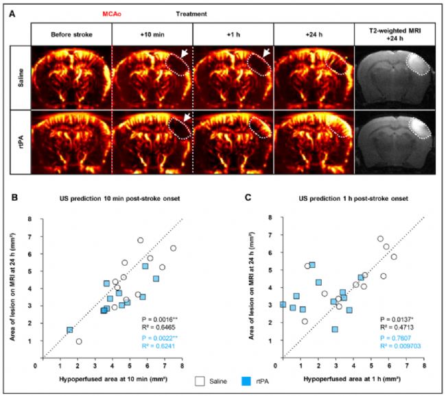 卒中后10分鐘的超聲低灌注區(qū)域與24小時MRI梗死體積顯著相關(Figure 5,對照組R²=0.6465,rtPA組R²=0.6241),表明早期超聲成像可用于預后預測。