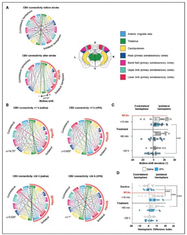 A-C 通過功能超聲繪制大腦區(qū)域間的連接圖,并引入功能性中線移位指標,發(fā)現卒中后連接迅速失衡(fMLS增加),而rtPA治療能快速減輕這種移位。