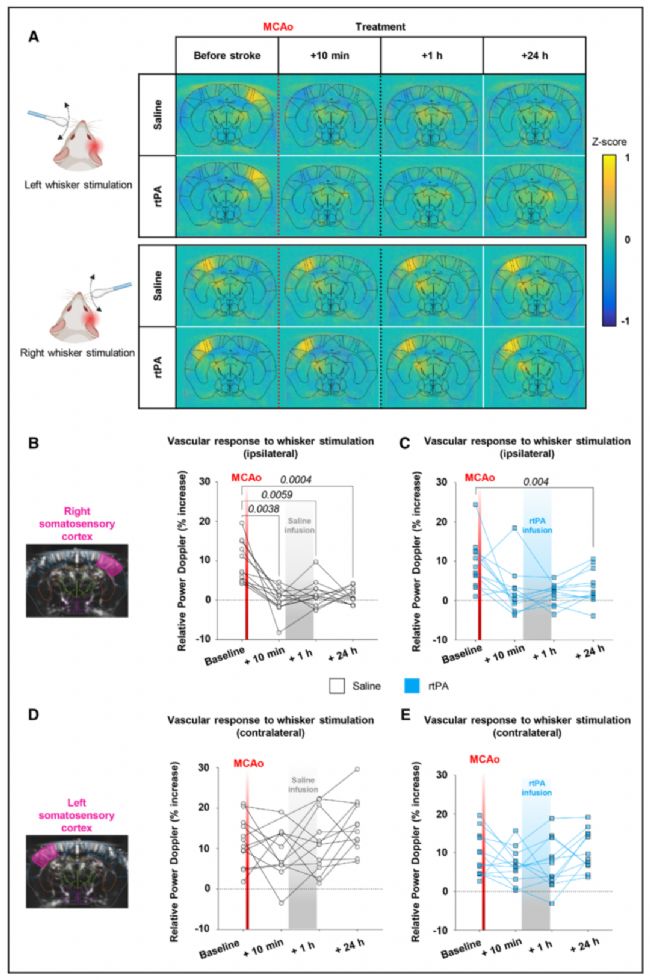 B-E 顯示卒中幾乎完全阻斷了患側大腦對觸須刺激的血流反應。在對照組中該功能缺失持續(xù)存在,而rtPA治療組在24小時顯示出部分功能恢復,且恢復程度與較小的梗死體積相關。