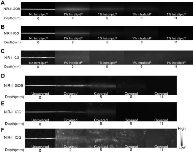 在不使用脂肪乳溶液的情況下,裝有GOB NPs水溶液的毛細管在近紅外二區(qū)窗口測得的半高全寬值為522.90±2.64 μm,這清晰地勾勒出毛細管輪廓。而裝有ICG水溶液的毛細管在近紅外一區(qū)和近紅外二區(qū)窗口的FWHM值分別為557.60±16.22 μm和525.40±9.17 μm。隨著沉浸深度增加,組織吸收和散射效應變得明顯。GOB NPs水溶液毛細管在近紅外二區(qū)窗口的FWHM值隨2、5、8、11毫米深度依次增至1672.66±34.52 μm、2496.64±25.82 μm、3815.70±169.12 μm和5159.43±59.13 μm(圖1A)。當沉浸深度為8毫米時,毛細管輪廓仍保持可見。對于ICG水溶液毛細管,在近紅外二區(qū)窗口的FWHM值隨2、5、8、11毫米深度分別達到2277.49±63.38 μm、3443.93±34.99 μm、4919.09±115.64 μm和5218.40±28.74 μm(圖1B)。在近紅外一區(qū)窗口,ICG水溶液毛細管在2、5、8、11毫米深度的FWHM值依次為4990.79±61.34μm、5228.48±66.10 μm、5275.77±57.70 μm和5252.94±81.65 μm(圖1C)。其近紅外二區(qū)熒光圖像的最大可識別深度為5毫米。當沉浸深度達到2毫米時,ICG水溶液毛細管的近紅外一區(qū)熒光圖像清晰度顯著下降至幾乎無法分辨的程度。