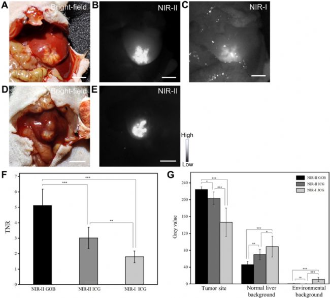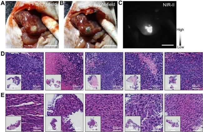 在瘤內(nèi)注射GOB NPs后,在白光下觀察到腫瘤內(nèi)快速染料擴散(圖2A,B),通過NIR-II成像獲得的熒光信號與腫瘤的視覺輪廓相關(圖2C)。病理結(jié)果顯示熒光圖像信號與腫瘤的實際邊界一致(圖2D,E),從而證實了肝癌組織中GOB NPs的靶向聚集。