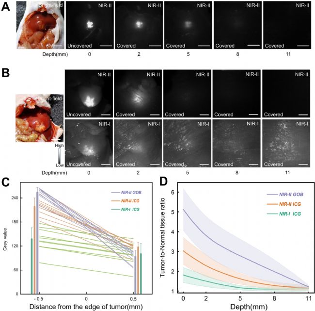 當覆蓋2、5、8及11毫米不同厚度的雞胸組織時,裝載GOB NPs水溶液的毛細管在近紅外二區(qū)窗口的半高全寬值分別為939.85±49.31 μm、1923.54±50.14 μm、3771.95±286.18 μm和5996.67±258.70 μm(圖1D)。同樣地,在相同雞胸組織厚度條件下,裝載ICG水溶液的毛細管在近紅外二區(qū)窗口的FWHM值分別為1471.60±49.27 μm、3112.21±142.69 μm、5776.92±236.61 μm和6119.07±188.00 μm(圖1E)。在近紅外一區(qū)窗口,裝載ICG水溶液的毛細管在相同組織厚度下的FWHM值則分別為3155.22±127.63μm、4748.15±376.32 μm、5928.54±142.08 μm和6242.55±106.63 μm(圖1F)。與脂肪乳浸沒成像結(jié)果一致,GOB NPs水溶液在近紅外二區(qū)窗口的最大成像深度為8毫米;而ICG水溶液在近紅外二區(qū)窗口的最大成像深度為5毫米,在近紅外一區(qū)窗口僅為2毫米。這些數(shù)據(jù)進一步證實了GOB NPs相較于ICG在組織穿透性方面的顯著優(yōu)勢。