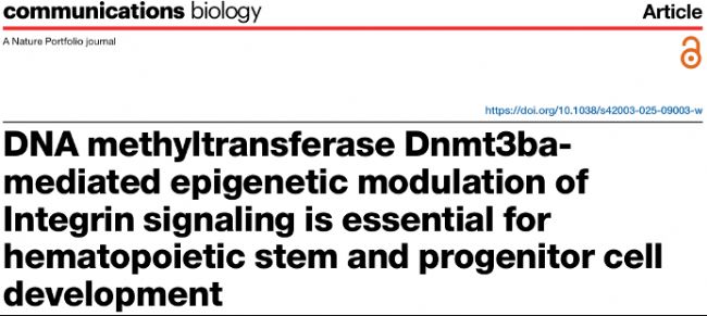 Ai K, Wu Y, Liang G, Kong H, Yang X, Li N, Liu Z, Dong Y, Xu J, Zhang L, Chen X, Fu Y, Wang L, Li L. DNA methyltransferase Dnmt3ba-mediated epigenetic modulation of Integrin signaling is essential for hematopoietic stem and progenitor cell development. Commun Biol. 2025 Nov 19;8(1):1612. doi: 10.1038/s42003-025-09003-w.