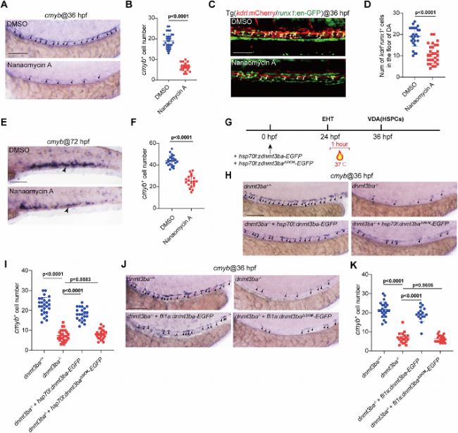 使用DNMT3B抑制劑Nanaomycin A處理胚胎或構(gòu)建甲基轉(zhuǎn)移酶結(jié)構(gòu)域缺失突變體(dnmt3baΔDCM),均導(dǎo)致HSPC標(biāo)志物cmyb表達(dá)下降(圖2)。挽救實(shí)驗(yàn)中,僅全長(zhǎng)Dnmt3ba可恢復(fù)突變體表型,證明其功能依賴甲基化活性。內(nèi)皮特異性挽救部分恢復(fù)HSPC生成,表明Dnmt3ba在ECs中自主發(fā)揮作用。這些發(fā)現(xiàn)共同確立了Dnmt3ba通過(guò)其催化活性調(diào)控HSPC發(fā)育的分子基礎(chǔ),為后續(xù)探索其下游靶基因提供了因果鏈。