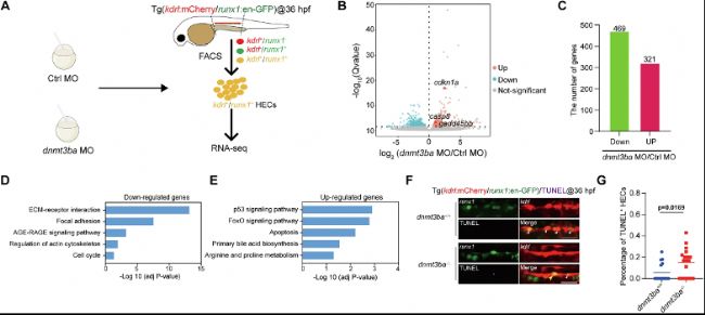 為解析Dnmt3ba調(diào)控的分子網(wǎng)絡(luò),研究對(duì)約5000個(gè)分選的HECs進(jìn)行RNA-seq。差異表達(dá)分析鑒定出790個(gè)差異表達(dá)基因(DEGs)(321個(gè)上調(diào),469個(gè)下調(diào)),提示Dnmt3ba主要作為轉(zhuǎn)錄激活因子。KEGG富集分析揭示下調(diào)基因顯著富集于"ECM-受體互作"和"黏著斑"通路,而上調(diào)基因富集于"P53信號(hào)通路"和"細(xì)胞凋亡"通路,提示Dnmt3ba缺失導(dǎo)致HEC黏附能力受損并觸發(fā)凋亡程序。qRT-PCR驗(yàn)證促凋亡基因cdkn1a、gadd45bb和casp8的上調(diào),TUNEL實(shí)驗(yàn)揭示dnmt3ba-/-胚胎中HEC凋亡率顯著升高,證實(shí)P53介導(dǎo)的凋亡是表型核心機(jī)制,表明Dnmt3ba通過(guò)抑制凋亡維持HEC存活。該轉(zhuǎn)錄組分析為WGBS靶基因篩選提供了功能線索,特別是將Integrin信號(hào)與細(xì)胞凋亡關(guān)聯(lián)起來(lái),為后續(xù)機(jī)制研究指明了方向。