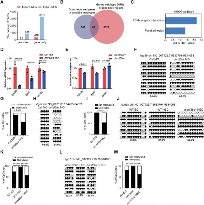 圖4:dnmt3ba缺失降低Integrin信號(hào)基因的甲基化和表達(dá)水平。