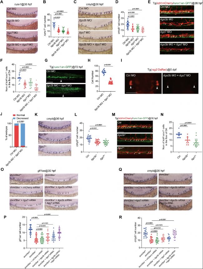 (6)Itga3b和Itga7參與Dnmt3ba調(diào)控的HSPC發(fā)育