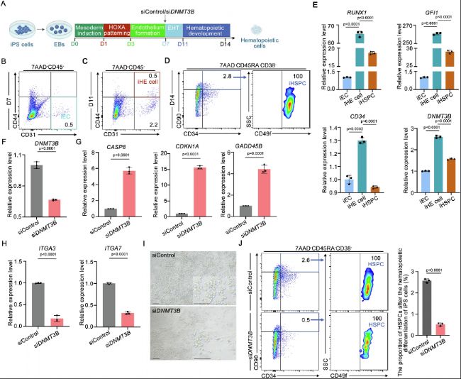 跨物種保守性驗(yàn)證是機(jī)制研究向臨床轉(zhuǎn)化的關(guān)鍵。在人iPSC造血分化體系中,DNMT3B在iHE細(xì)胞和iHSPCs中高表達(dá)。siRNA敲低DNMT3B后,iHE細(xì)胞中ITGA3和ITGA7表達(dá)下降,而促凋亡基因CDKN1A、GADD45B、CASP8上調(diào),與斑馬魚(yú)表型高度一致。流式分析顯示,DNMT3B敲低導(dǎo)致iHSPCs(CD34+CD90+CD49f+CD38-CD45RA-)比例顯著降低,表明其功能從斑馬魚(yú)到人均保守。這一驗(yàn)證不僅強(qiáng)化了研究結(jié)論的普適性,也確立了人EHT過(guò)程中"DNMT3B-Integrin-存活信號(hào)"軸的存在,為體外HSC生成提供了潛在分子靶點(diǎn)。