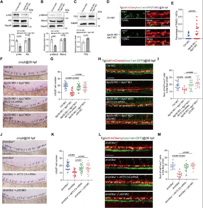 機(jī)制上,itga3b/itga7缺失抑制Akt磷酸化和Mdm2活化,導(dǎo)致P53積累并引發(fā)HEC凋亡(圖6A-H)。激活A(yù)kt或抑制P53均可挽救dnmt3ba突變體的HSPC缺陷(圖6I-M),證實(shí)該信號(hào)軸是Dnmt3ba調(diào)控HEC存活的核心通路。值得注意的是,RNA-seq中FoxO信號(hào)通路和細(xì)胞骨架調(diào)控基因也發(fā)生改變,提示可能存在其他平行通路,但Akt-Mdm2-P53軸是核心存活機(jī)制。該發(fā)現(xiàn)將表觀遺傳調(diào)控與經(jīng)典信號(hào)整合,揭示了EHT過(guò)程中"表觀-信號(hào)-存活"的級(jí)聯(lián)反應(yīng),為理解HSPC發(fā)育失敗提供了完整邏輯鏈。