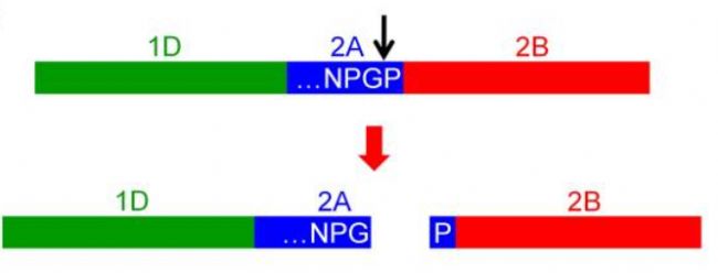 2A肽是Ryan和他的同事在口蹄疫病毒(FMDV)中首次發(fā)現(xiàn)的一種“自我切割”的小肽,此外在其它病毒中也發(fā)現(xiàn)了2A肽類似序列,其平均長度為18-22個氨基酸,且具有高度保守的C末端序列:-DxExNPGP- 。2A元件會導(dǎo)致核糖體跳過2A肽C末端的甘氨酰(G)— 脯氨酰(P)肽鍵的合成,從而“斷裂”為兩個獨(dú)立的蛋白。這個過程被形象地稱為“核糖體跳躍”。