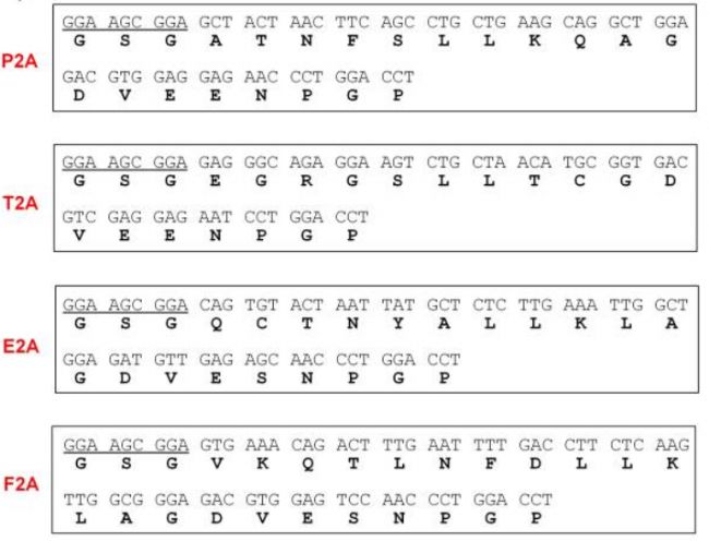 Fig.3 不同2A肽的DNA及相應(yīng)氨基酸序列,帶下劃線的序列編碼氨基酸GSG,添加GSG可以提高剪切效率【2】