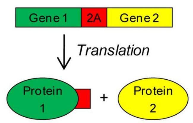 Fig.4 用2A連接2個基因可以從一個轉(zhuǎn)錄本生成兩個單獨(dú)的多肽【3】
