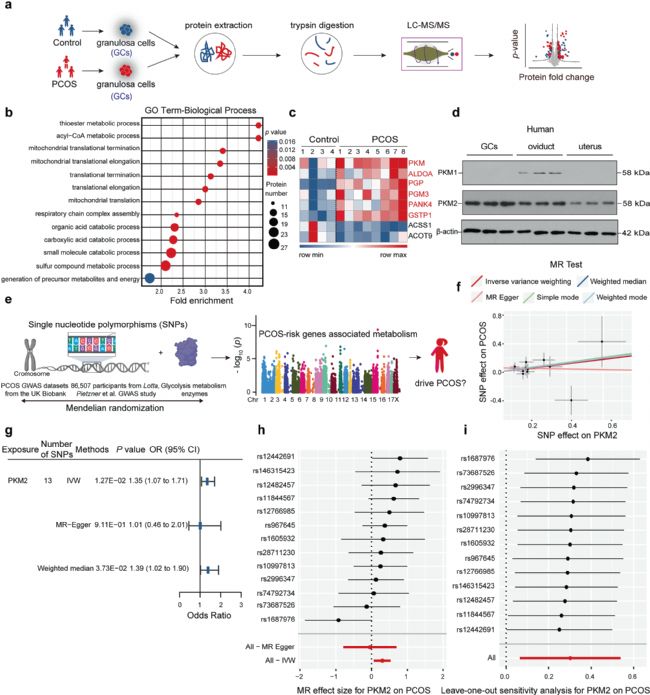 進一步通過孟德爾隨機化(MR)分析發(fā)現(xiàn),遺傳預(yù)測的PKM2水平升高與PCOS風(fēng)險存在顯著因果關(guān)聯(lián)(OR=1.35, 95% CI 1.07–1.71)(圖1f、g),且敏感性分析支持該結(jié)果的穩(wěn)健性(圖1h、i)。以上結(jié)果表明,PKM2是驅(qū)動PCOS發(fā)病的核心候選因子。