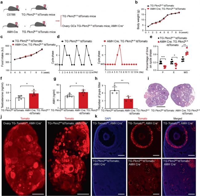 為研究PKM2上調(diào)對PCOS發(fā)生發(fā)展是否具有關(guān)鍵作用,研究團隊將Rosa26-loxP-Stop-loxP-Pkm2-2A-tdTomato(TG PKM2fl/fl tdTomato)小鼠與AMH-Cre小鼠進行交配,獲得了在卵巢GCs中特異性過表達Pkm2的小鼠(圖3a)。結(jié)果表明,該小鼠出現(xiàn)典型PCOS樣特征:動情周期紊亂(圖3d、e),血清睪酮和抗穆勒管激素(AMH)水平顯著升高,生育率下降(圖3f-h);此外,H&E染色結(jié)果顯示,與對照組小鼠相比,GCs特異性過表達Pkm2的小鼠黃體數(shù)量減少,小卵泡數(shù)量增多(圖3i)。Whole-Mount熒光和免疫染色顯示,tdTomato表達主要定位于卵巢GCs,卵巢GCs中特異性過表達Pkm2小鼠卵巢中含有大量小卵泡,表明該小鼠排卵障礙(圖3j、k)。