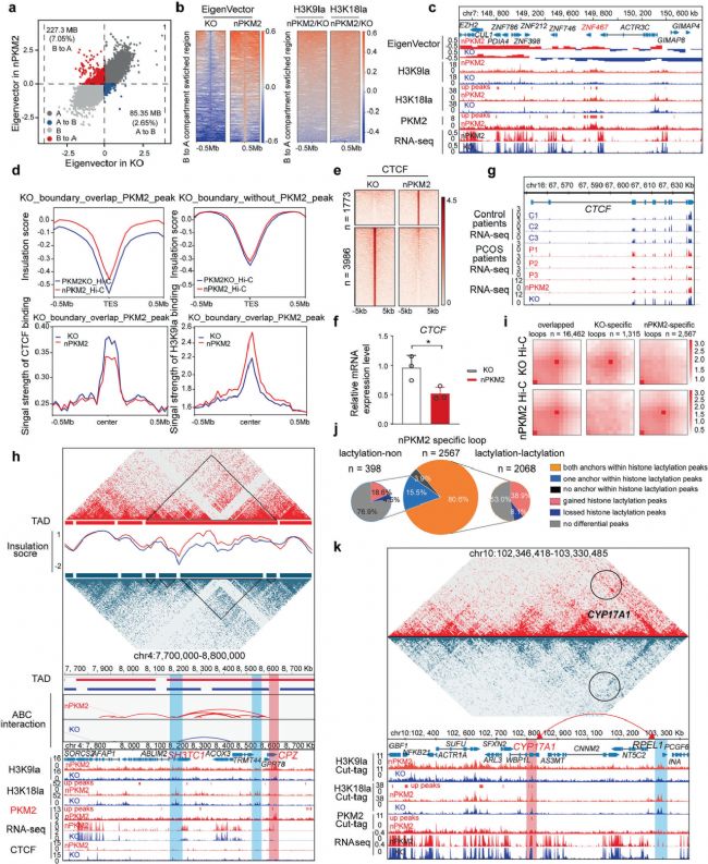 研究發(fā)現(xiàn),核PKM2過表達顯著增加細(xì)胞核內(nèi)乳酸濃度,且高雄激素PCOS患者血漿與卵泡液中乳酸水平明顯升高(圖4a、b)。進一步CUT&Tag分析顯示,核PKM2使組蛋白H3的K9、K18及K27位點乳酸化修飾全局性增強,超過70%的組蛋白乳酸化差異峰在核PKM2細(xì)胞中上調(diào)(圖4k),并與PKM2基因組結(jié)合位點高度重疊。這種表觀遺傳重塑導(dǎo)致266個基因顯著上調(diào),其中包括雄激素合成關(guān)鍵基因CYP17A1、CYP11A1以及PCOS相關(guān)基因WNT4、PADI3等(圖4i),這些基因主要富集于激素代謝與膽固醇生物合成通路(圖4j)。此外,研究團隊觀察到組蛋白乳;瘯T導(dǎo)基因組抑制區(qū)域轉(zhuǎn)為活躍狀態(tài),CTCF結(jié)合減少并增加染色質(zhì)環(huán)數(shù)量。上述結(jié)果表明,PKM2的核積累、染色質(zhì)結(jié)合增強、H3K9la修飾增強以及CTCF結(jié)合減少共同促進nPKM2細(xì)胞染色質(zhì)狀態(tài)更活躍,導(dǎo)致染色質(zhì)構(gòu)象的全局變化,進而促進與PCOS相關(guān)基因的表達。
