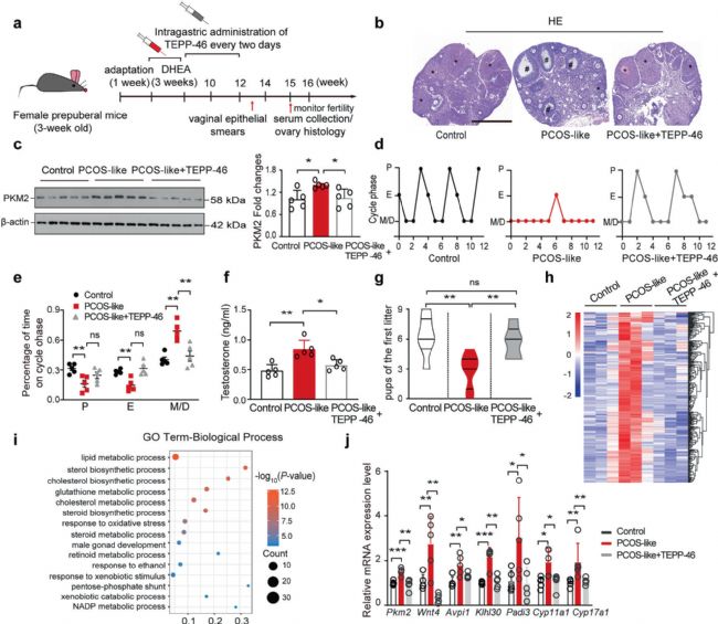 為探索其治療潛力,研究團隊使用TEPP-46(PKM2核轉(zhuǎn)運抑制劑)處理脫氫表雄酮(DHEA)誘導(dǎo)的PCOS小鼠模型(DHEA誘導(dǎo)可導(dǎo)致睪酮水平升高)(圖6a)。結(jié)果顯示,TEPP-46處理后囊狀卵泡和黃體數(shù)量與野生型小鼠相似(圖6b),小鼠卵巢顆粒細(xì)胞的PKM2水平顯著降低(圖6c),動情周期正常節(jié)律恢復(fù)(圖6d、e),血清睪酮水平降低并生育率得到改善(圖6f、g)。同時,對卵巢GCs進行RNA-seq進行分析,結(jié)果顯示,PCOS樣小鼠中前300個上調(diào)基因被TEPP-46治療抑制,產(chǎn)生的轉(zhuǎn)錄譜與WT小鼠相似(圖6h),進一步qPCR驗證,在TEPP-46處理的小鼠卵巢GCs中,PCOS相關(guān)基因如Pkm2、Wnt4、Klhl30、Avpi1、Padi3、Cyp11a1和Cyp17a1下調(diào)至WT小鼠水平(圖6j),即TEPP-46可抑制PCOS相關(guān)基因的異常表達。以上結(jié)果表明,靶向PKM2核轉(zhuǎn)運是治療PCOS的有效策略。