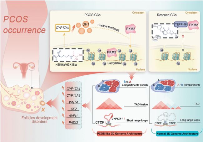 總之,研究團隊闡明了PKM2(一種關(guān)鍵的代謝酶)的失調(diào)在PCOS發(fā)病機制中的作用,并強調(diào)了組蛋白乳酸化在3D染色質(zhì)結(jié)構(gòu)中的重要性。GCs中PKM2的上調(diào)和核易位導(dǎo)致組蛋白乳酸化格局的改變,進而促進PCOS中3D基因組組織的全球變化。PKM2介導(dǎo)的組蛋白乙酰化導(dǎo)致更活躍的染色質(zhì)狀態(tài),允許某些遠端增強子通過新形成的環(huán)接近關(guān)鍵PCOS相關(guān)基因(如CPZ和CYP17A1)的啟動子,從而增加這些基因的表達。小分子TEPP-46調(diào)節(jié)PKM2活性并挽救PCOS樣表型的能力表明PKM2是治療PCOS的一個新的有前途的治療靶點。