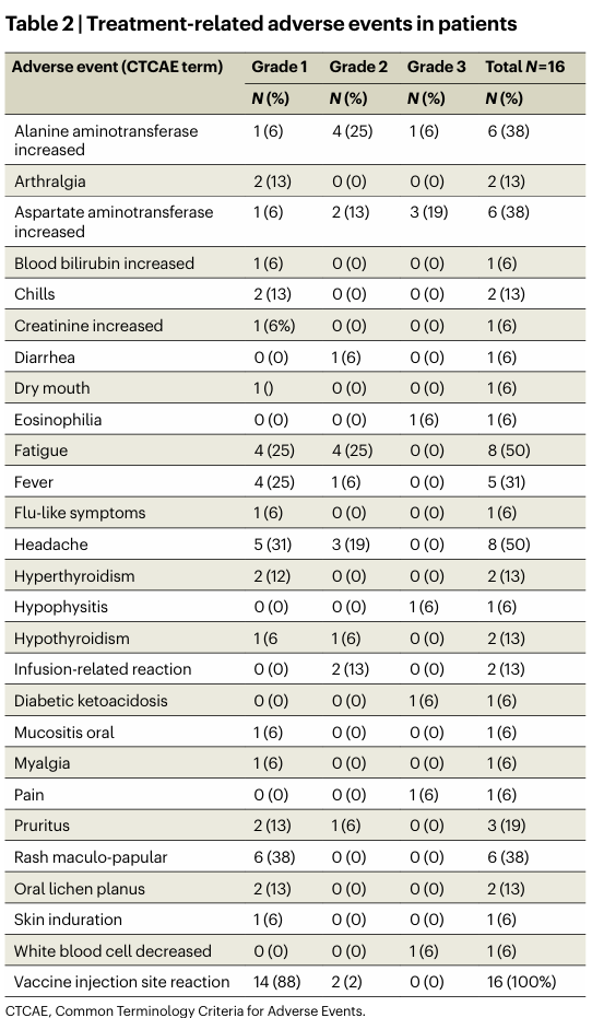 1. 安全性特征與治療耐受性在全部16例接受治療的患者中,聯(lián)合方案的安全性特征與已知的伊匹木單抗聯(lián)合納武利尤單抗的毒性譜基本一致。最常見的疫苗相關(guān)不良事件為注射部位反應(yīng)(16/16, 100%),均為1-2級(jí)。共有6例患者(37.5%)報(bào)告了3級(jí)治療相關(guān)不良事件,未觀察到4級(jí)或5級(jí)事件 (表1)。這表明在雙免疫檢查點(diǎn)抑制劑(ICI)基礎(chǔ)上加用肽疫苗,未引發(fā)新的安全性問題。