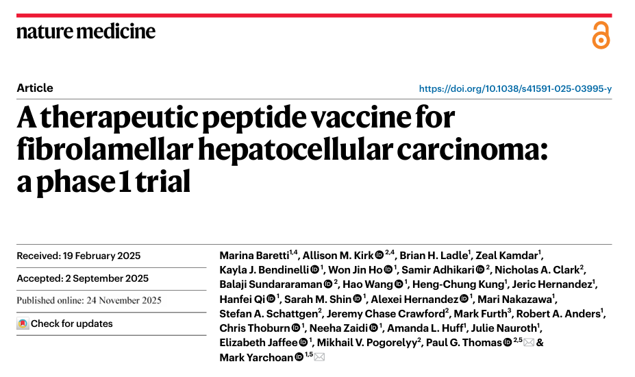 該I期臨床試驗(yàn)研究顯示,一種靶向纖維板層型肝癌(FLC)特有DNAJ-PKAc融合蛋白的“現(xiàn)貨型”off-the-shelf 治療性新生抗原疫苗(FLC-Vac),聯(lián)合納武利尤單抗與伊匹木單抗,在晚期FLC患者中展現(xiàn)出可管理的安全性、強(qiáng)勁的免疫原性及令人鼓舞的臨床活性。該研究為通過免疫策略靶向“不可成藥”的致癌驅(qū)動(dòng)因子提供了開創(chuàng)性概念驗(yàn)證。