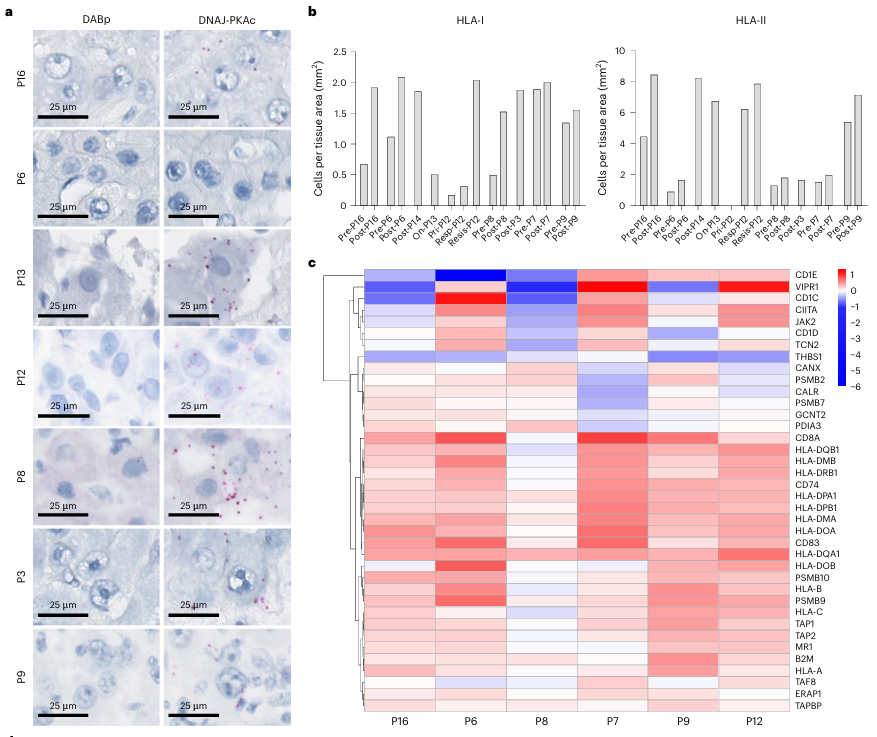 3.靶向驅(qū)動(dòng)性新抗原的優(yōu)勢:與隨機(jī)突變產(chǎn)生新抗原不同,致癌融合蛋白是腫瘤維持惡性表位所必需的,因此不易因免疫編輯而丟失,可最大程度避免抗原丟失導(dǎo)致的耐藥。本研究在治療后的耐藥病灶中均未檢測到DNAJ-PKAc或HLA分子的丟失,印證了這一點(diǎn) (圖Fig. 3a, 3b, 3c)。