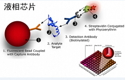 液態(tài)懸浮芯片將抗體包被在微珠上,利用夾心法原理進(jìn)行蛋白質(zhì)抗原的定量檢測(cè)。