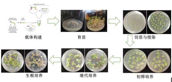 葆光生物采用農(nóng)桿菌介導(dǎo)的葉盤轉(zhuǎn)化法進(jìn)行植物遺傳轉(zhuǎn)化,其主要過程包括:提取目的基因片段,導(dǎo)入質(zhì)粒構(gòu)建目...