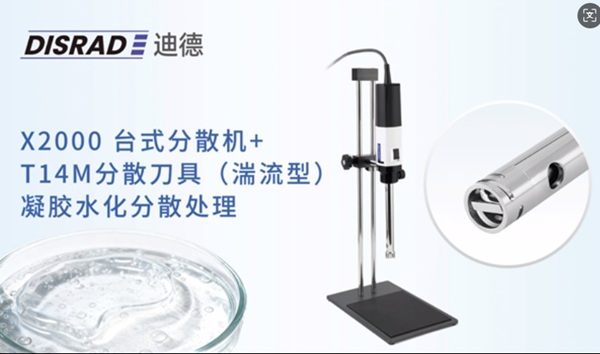 DISRAD迪德 X2000分散機+T14M分散刀具(湍流型)——凝膠水化分散處理,T系列湍流型分散刀具、轉(zhuǎn)子槳葉式設(shè)計,產(chǎn)生眾多小渦流,剪切力低,熱量低,可快速去除懸浮泡沫或細(xì)小顆粒