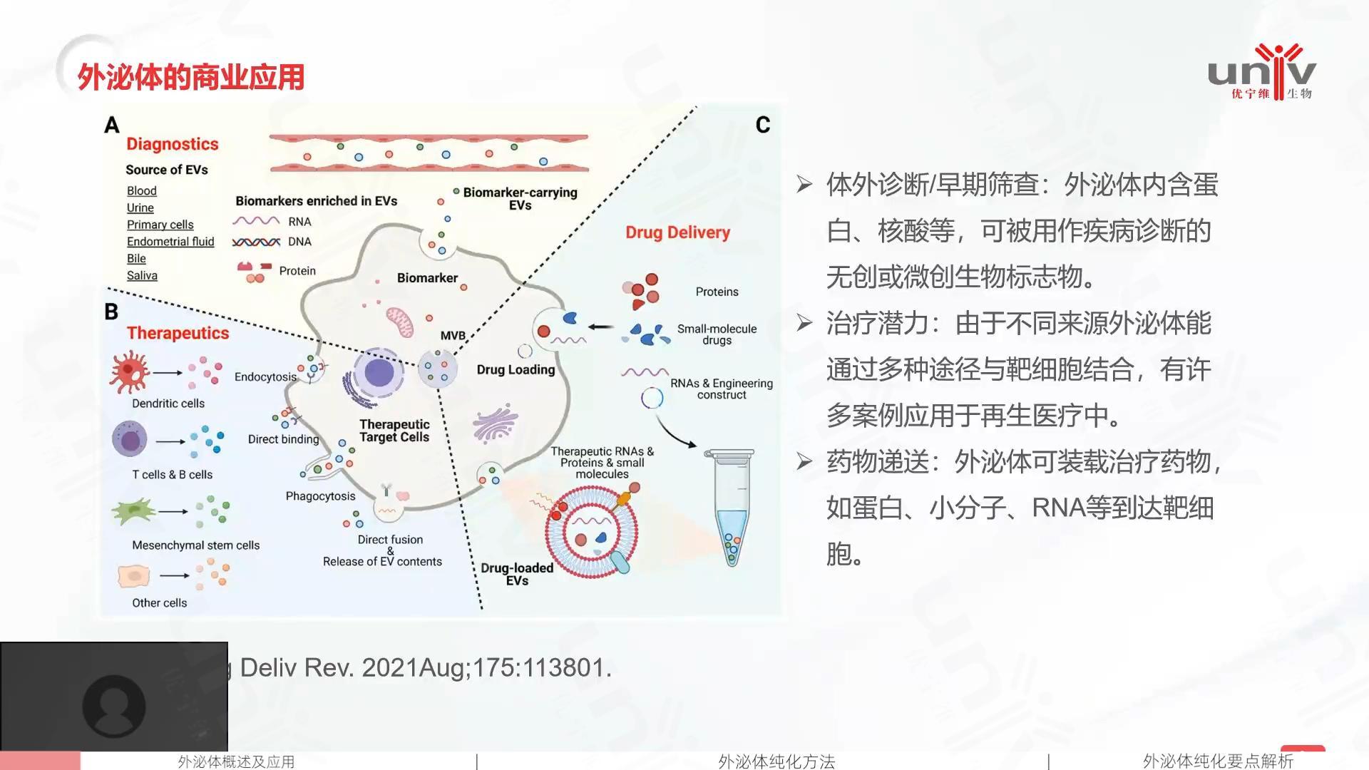 視頻介紹了外泌體的商業(yè)應(yīng)用,主要有三大模塊,包括體外診斷/疾病早篩,再生醫(yī)療治療潛力,藥物遞送,此外外泌體在醫(yī)療美容和護(hù)膚品領(lǐng)域應(yīng)用潛力也非常大。