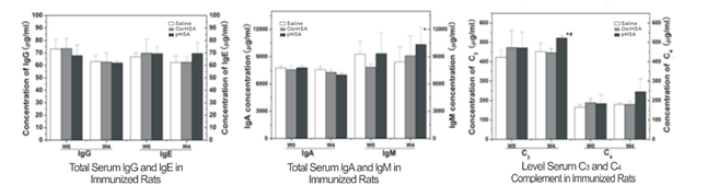 經(jīng)過OsrHSA免疫后的大鼠體內(nèi)的各個(gè)抗體IgG,IgE,IGA和IgM的變化與對(duì)照的pHSA和PBS實(shí)驗(yàn)組相比無明顯差異;OsrHSA免疫的家兔血清中,C3因子和C4因子與pHSA和PBS的影響一致,標(biāo)明OsrHSA對(duì)于機(jī)體的免疫刺激比較低。